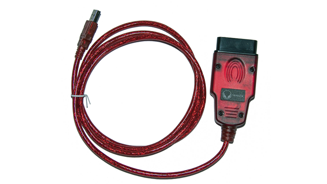 The “red cable”, which is a special version of the OBDLink SX OBD-II diagnostics tool. It is a one-piece assembly with a USB connector on one end of the cable and an OBD-II connector on the other end. It may carry the TRIFECTA logo, though some units in the field will say OBDLink SX (see below).