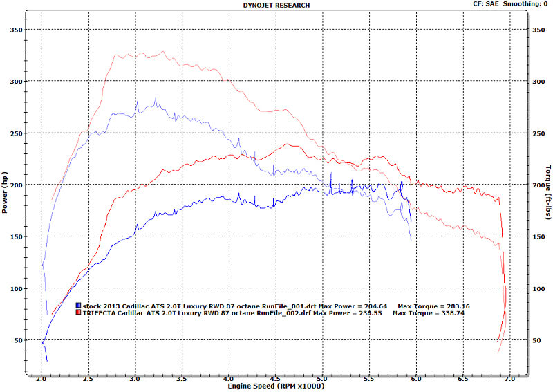Dyno sheet: TRIFECTA T30.1 Cadillac ATS LTG Intake Powerkit dyno graph (87 octane pump gas) (this vehicle is a 2013 Cadillac ATS with a LTG 2.0T engine) - stock wheels/tires: