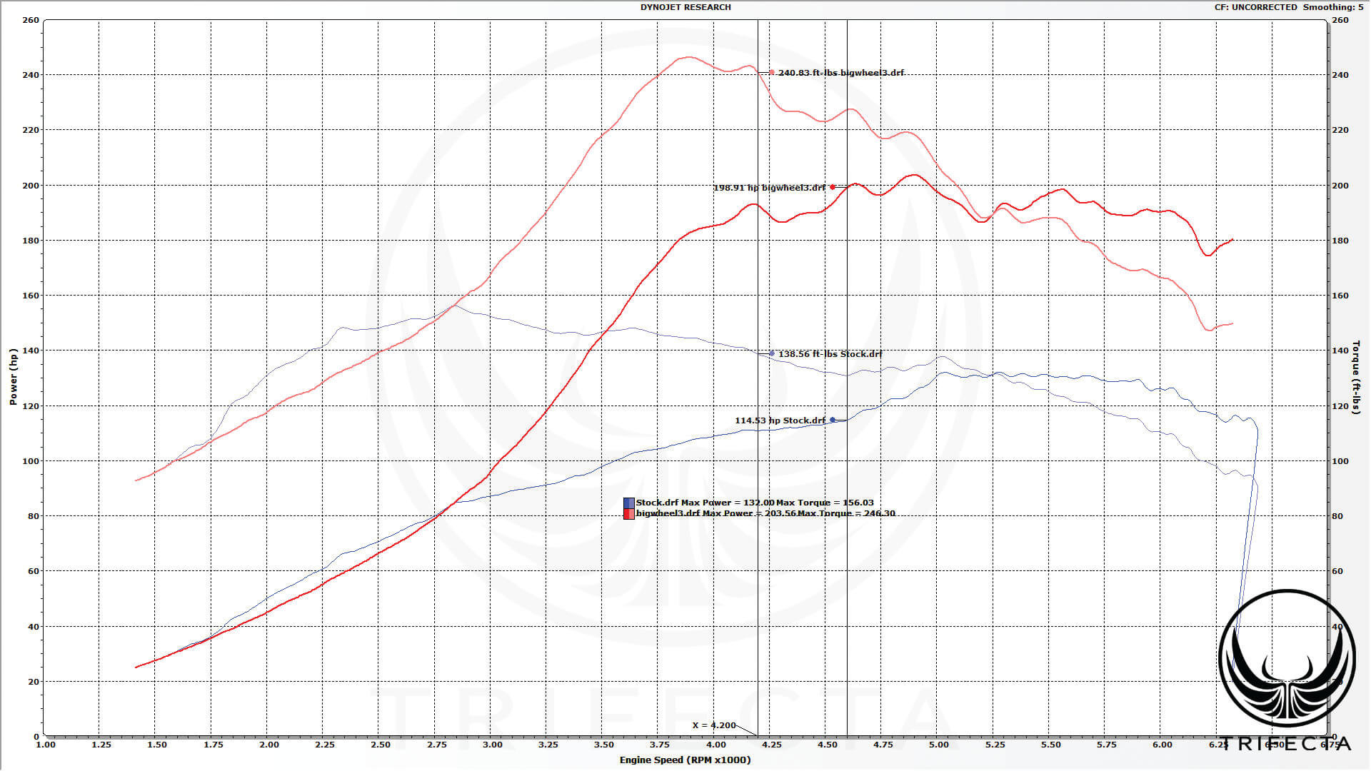 In general, we were quite impressed with the results. This particular dyno is notoriously “stingy” and we managed to break 200WHP and hit almost 250WTQ. We noted a slight drop in power below 3000 RPM (likely due to the increased exhaust flow required to spool the turbo), but by around 2750RPM, the power levels were almost the same.