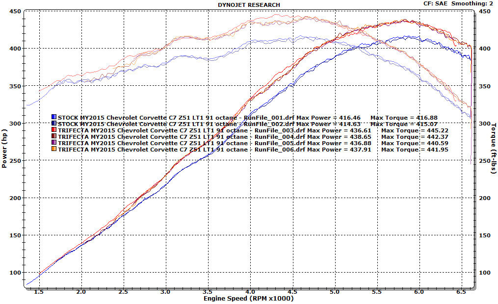 This release post is a presentation of the software engineering capabilities of TRIFECTA Performance: TRIFECTA presents a complete powertrain power delivery profile recalibration for the MY2014+ Chevrolet Corvette / Corvette Z51 engine and corresponding 8L90 automatic transmission reprogramming. The TRIFECTA Performance Chevrolet Corvette C7 LT1 6.2L and Corvette C7 Z51 LT1 6.2L MY2014+ powertrain calibration is an easy to install software performance recalibration with an EZ Flash cable device that will yield specific gains of up to +31 ft-lbs @3550 RPM and +24 WHP @5575 RPM (Peak gains of up to +26 ft-lbs and +22 WHP) to a completely stock Chevrolet Corvette LT1 6.2 MY2014+ vehicle.