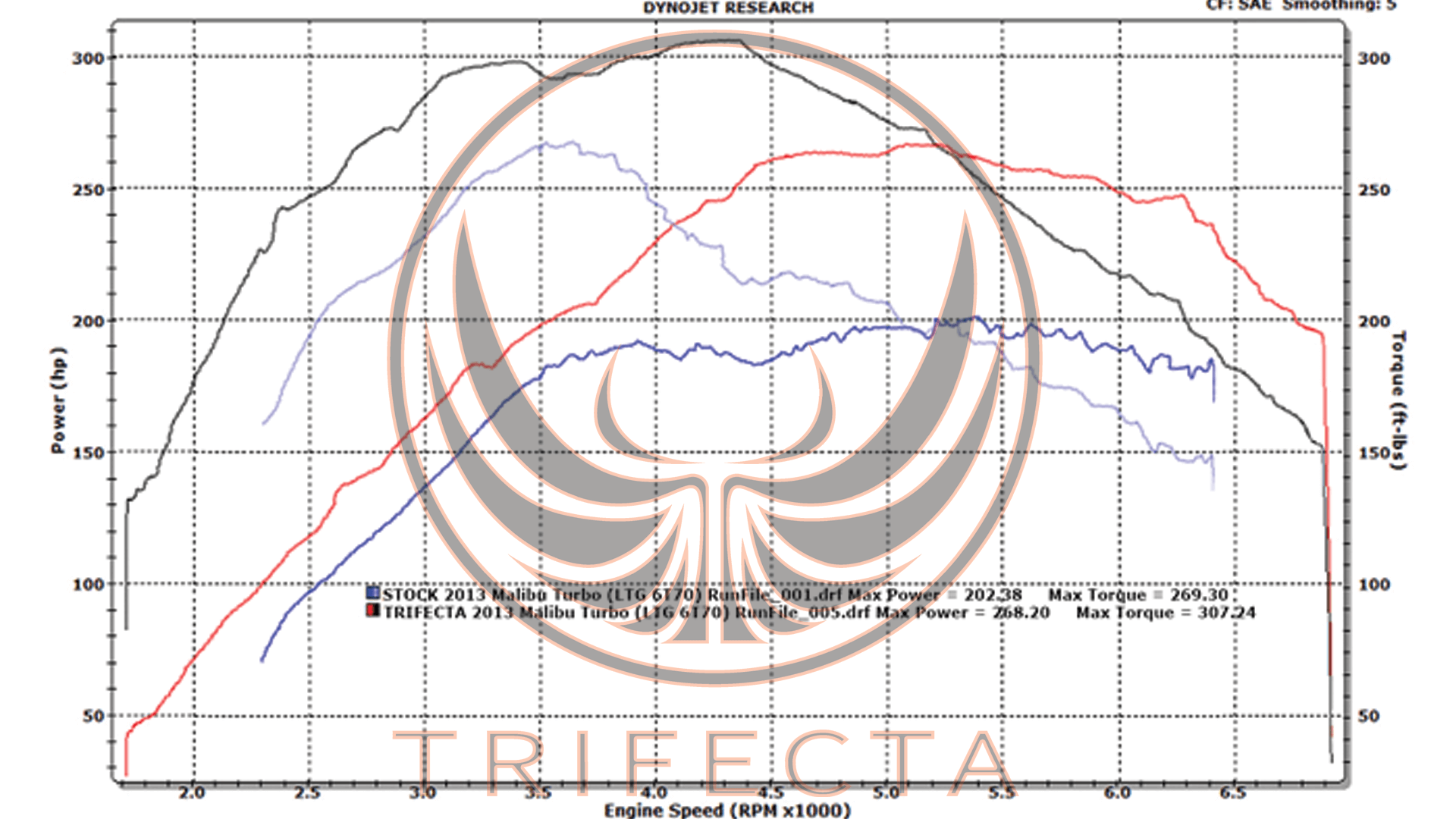 TRIFECTA presents a complete powertrain power delivery profile recalibration for the MY2013--2015 Chevrolet Malibu Turbo 2.0T LTG engine and corresponding 6T70 automatic transmission reprogramming. The TRIFECTA Performance Chevrolet Malibu Turbo 2.0T MY2013--2015 powertrain calibration is an easy to install software performance recalibration with an EZ Flash cable device that will yield specific power increases of up to +83 ft-lbs and +62 WHP (Peak vs peak gains of up to +38 ft-lbs and +66 WHP) to a completely stock Chevrolet Malibu Turbo 2.0T MY2014.