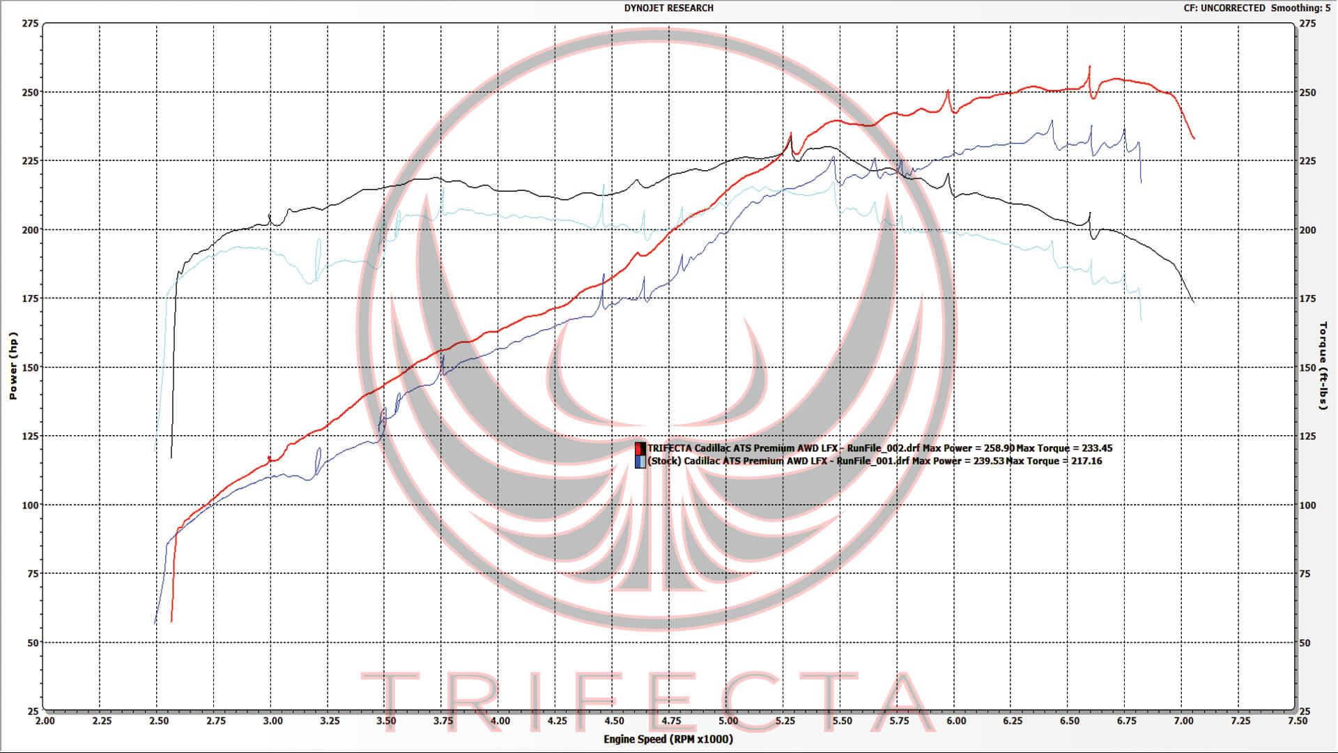 TRIFECTA presents a complete powertrain power delivery profile recalibration for the MY2013--MY2015 Cadillac ATS LFX, corresponding Hydra-Matic 6L45 automatic transmission reprogramming. The TRIFECTA Performance Cadillac ATS LFX MY2013--MY2015 powertrain calibration is an easy to install software performance recalibration with an EZ Flash cable device that will yield gains of up to +29 ft-lbs and +27 WHP (Peak gains of up to +16 ft-lbs and +19 WHP) to a completely stock Cadillac ATS LFX/6L45 MY2014.