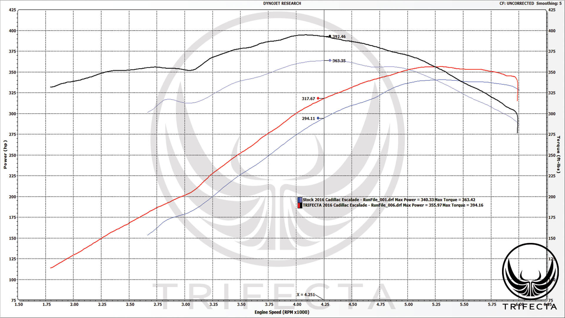 TRIFECTA is pleased to announce the immediate availability of the 2015--2020 Chevrolet Tahoe / Suburban, GMC Yukon, Cadillac Escalade/ESV vehicle software recalibration (reflash) for vehicles utilizing either the 5.3L V8 or the 6.2L V8 with either the 10 speed automatic transmission (10R80 / RPO: MF6), 8 speed automatic transmission (8L90 / RPO:M5U) or the 6 speed automatic transmission (6L80 / RPO:MYC). Two wheel drive (2WD), four wheel drive (4WD) and all wheel drive (AWD) variants are supported. Specific gains over factory calibration are up to (uncorrected) 45lb-ft of torque and 19 horsepower with no vehicle modifications beyond the updated software calibration.
