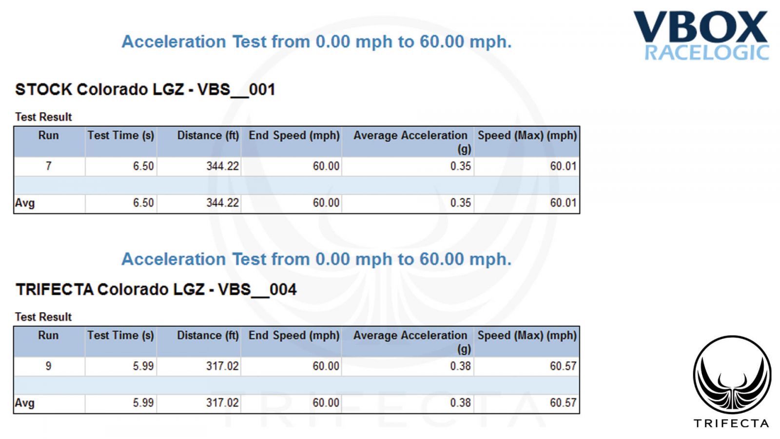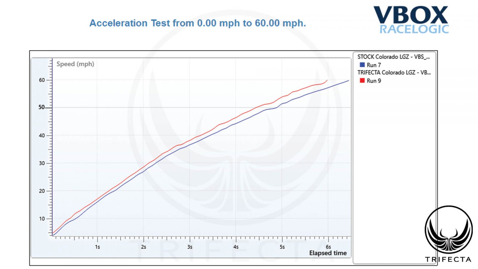 Using professional grade industry-standard telemetry equipment, TRIFECTA has also established proven gains of up to .5 seconds in 0-60MPH acceleration times versus the factory calibration through power gains, throttle ramp rates, and shift schedule optimization.