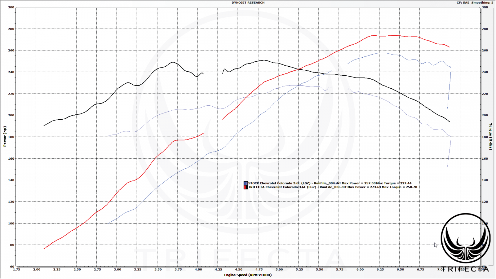 Using a chassis dynamometer, TRIFECTA has established proven gains in torque and horsepower!