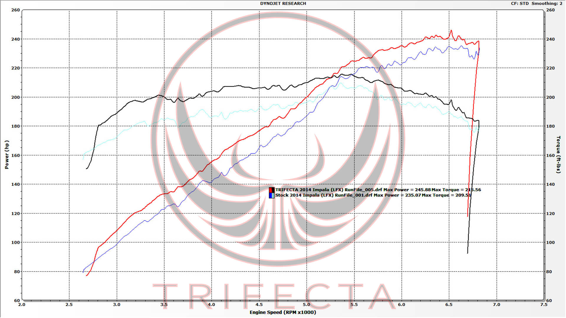 TRIFECTA presents a complete powertrain power delivery profile calibration (performance tune) for the MY2012--2013 and MY2014--Present Chevrolet Impala Limited 3.6L LFX engine and corresponding 6T70 automatic transmission reprogramming. The TRIFECTA Performance powertrain calibration is an easy to install software performance calibration with an EZ Flash cable device that will yield gains of up to +23 ft-lbs and +22 WHP under the curve (and +6 ft-lbs and +11 WHP peak on 91 octane) to a completely stock Chevrolet Impala 3.6L (LFX) MY2012--2013 and MY2014--Present Chevrolet Impala Limited.