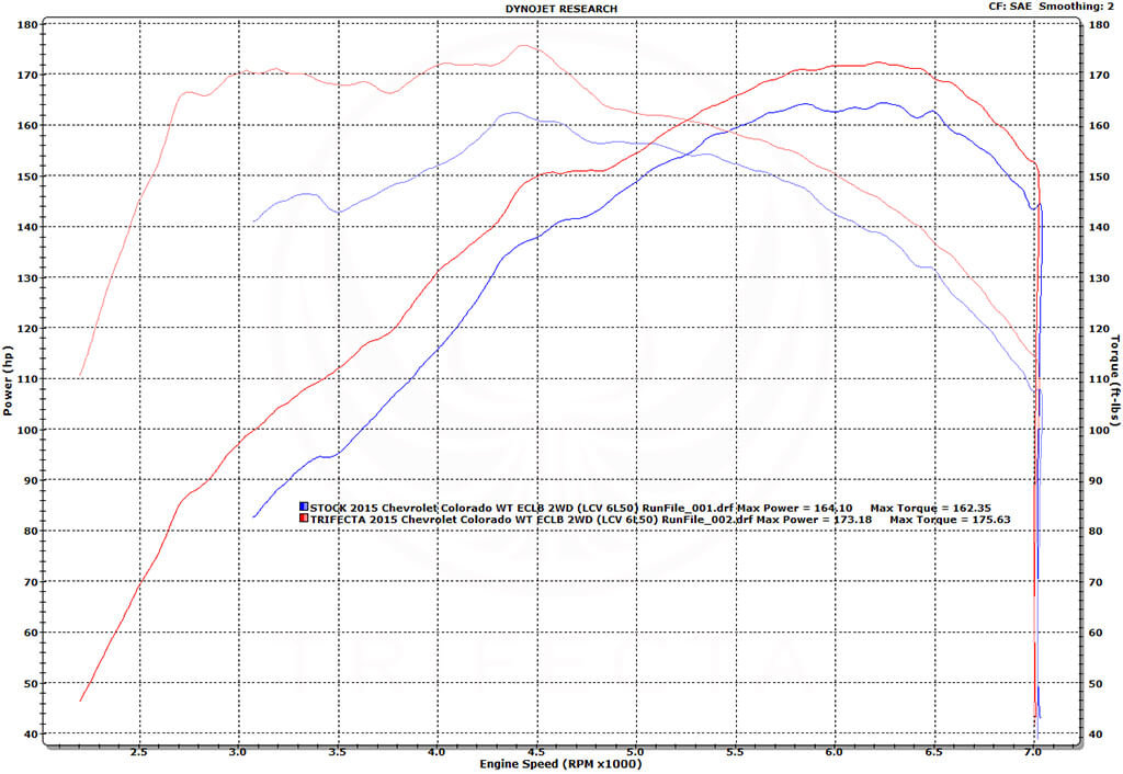 This release post is a presentation of the software engineering capabilities of TRIFECTA Performance: TRIFECTA presents a complete powertrain power delivery profile recalibration for the MY2015+ Chevrolet Colorado / GMC Canyon 2.5L I4 LCV engine and corresponding 6L50 automatic transmission reprogramming. The TRIFECTA Performance Chevrolet Colorado 2.5L I4 LCV and GMC Canyon 2.5L I4 LCV MY2015+ powertrain calibration is an easy to install software performance recalibration with an EZ Flash cable device that will yield gains of up to +25 ft-lbs @ 3250 RPM and +16 WHP @ 3400 RPM (Peak vs peak gains of up to +13 ft-lbs and +9 WHP) to a completely stock Chevrolet Colorado 2.5 I4 (LCV) MY2015.