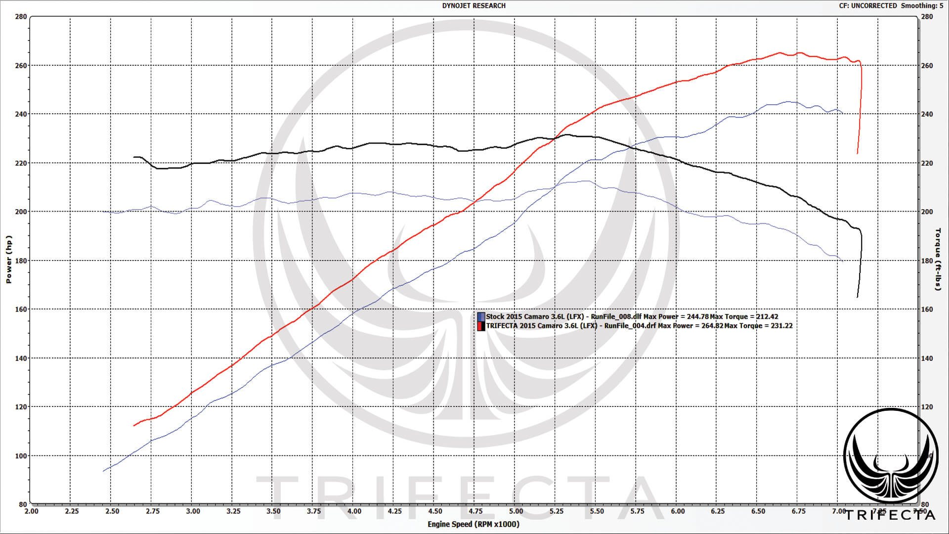 TRIFECTA presents a complete powertrain power delivery profile calibration for the MY2010--2015 Chevrolet Camaro LLT/LFX engine and corresponding 6L50 automatic transmission reprogramming. The TRIFECTA Performance Chevrolet Camaro LLT/LFX 3.6 powertrain calibration is an easy to install software performance calibration with an EZ Flash cable device that will yield gains of up to +22 ft-lbs and +23 WHP (Peak gains of up to +19 ft-lbs and +20 WHP) to a completely stock Chevrolet Camaro LLT/LFX 3.6.