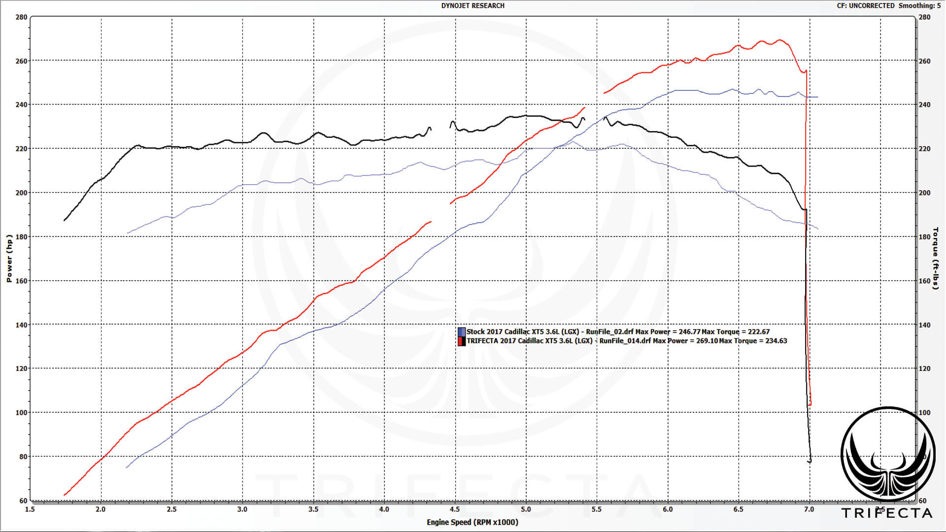 TRIFECTA presents a complete powertrain power delivery profile calibration for the Cadillac XT5 (RPO: LGX) engine and corresponding 8-speed Aisin AF50-8 (RPO: MRC) automatic transmission reprogramming. The TRIFECTA Performance Cadillac XT5 LGX powertrain calibration is an easy to install software performance calibration with an EZ Flash cable device (EZ Flash Cable) that will yield gains of up to +17 ft-lbs and +23 WHP (Peak gains of up to +12 ft-lbs and +22 WHP) to a completely stock Cadillac XT5 LGX.