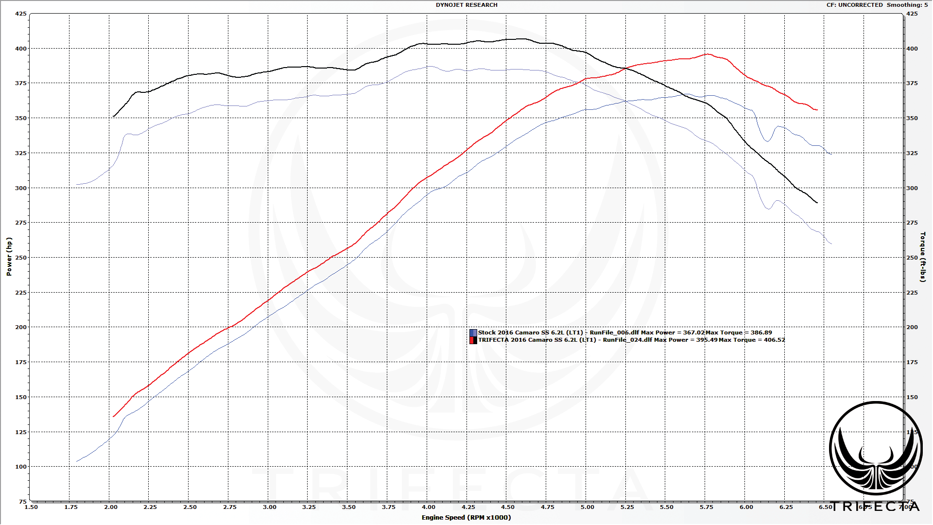 TRIFECTA presents a complete powertrain power delivery profile calibration for the 6th Generation MY2016--2024 Chevrolet Camaro SS 6.2L (RPO: LT1) engine with TR6060 (RPO: MM6) manual transmission and available 8-speed 8L90 (RPO: M5U) and 10-speed 10L90 (RPO: MI2 ) automatic transmission reprogramming. The TRIFECTA Performance Chevrolet Camaro SS 6.2L LT1 powertrain calibration is an easy to install software performance calibration with an EZ Flash cable device (EZ Flash Cable) that will yield gains of up to +35 ft-lbs and +40 WHP (Peak gains of up to +20 ft-lbs and +28 WHP) to a completely stock Chevrolet Camaro SS 6.2L LT1.