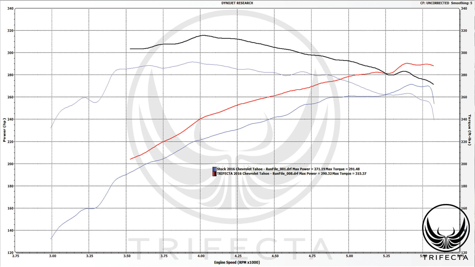 TRIFECTA is pleased to announce the immediate availability of the 2015--2020 Chevrolet Tahoe / Suburban, GMC Yukon, Cadillac Escalade/ESV vehicle software recalibration (reflash) for vehicles utilizing either the 5.3L V8 or the 6.2L V8 with either the 10 speed automatic transmission (10R80 / RPO: MF6), 8 speed automatic transmission (8L90 / RPO:M5U) or the 6 speed automatic transmission (6L80 / RPO:MYC). Two wheel drive (2WD), four wheel drive (4WD) and all wheel drive (AWD) variants are supported. Specific gains over factory calibration are up to (uncorrected) 45lb-ft of torque and 19 horsepower with no vehicle modifications beyond the updated software calibration.