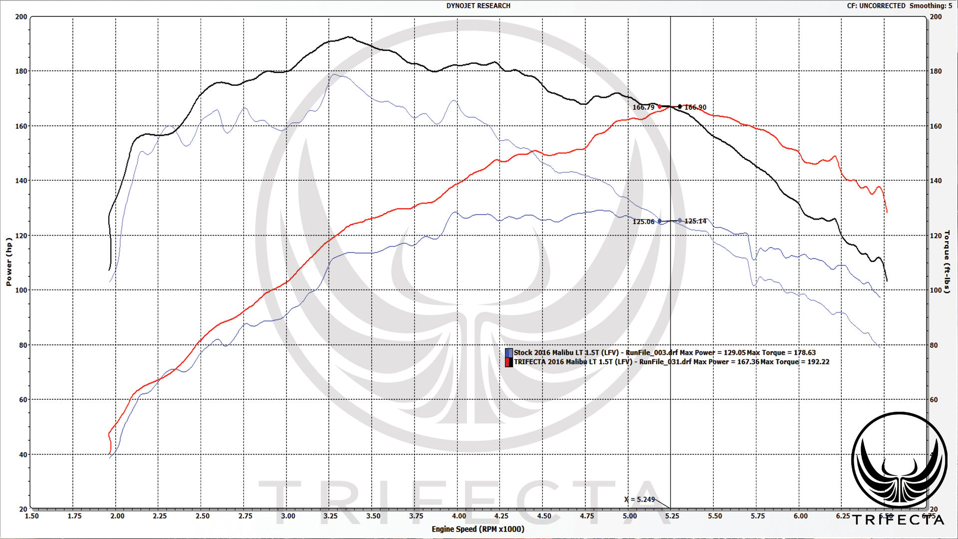TRIFECTA is pleased to announce the immediate availability of the 2018--2019 GMC Terrain vehicle software recalibration (reflash) for vehicles utilizing the 1.5L Turbo (RPO: LYX, LSD) with 9 speed automatic transmission (9T45 / RPO: M3U). Specific gains over factory calibration are up to (uncorrected) 35lb-ft of torque and 48 horsepower with no vehicle modifications beyond the updated software calibration.