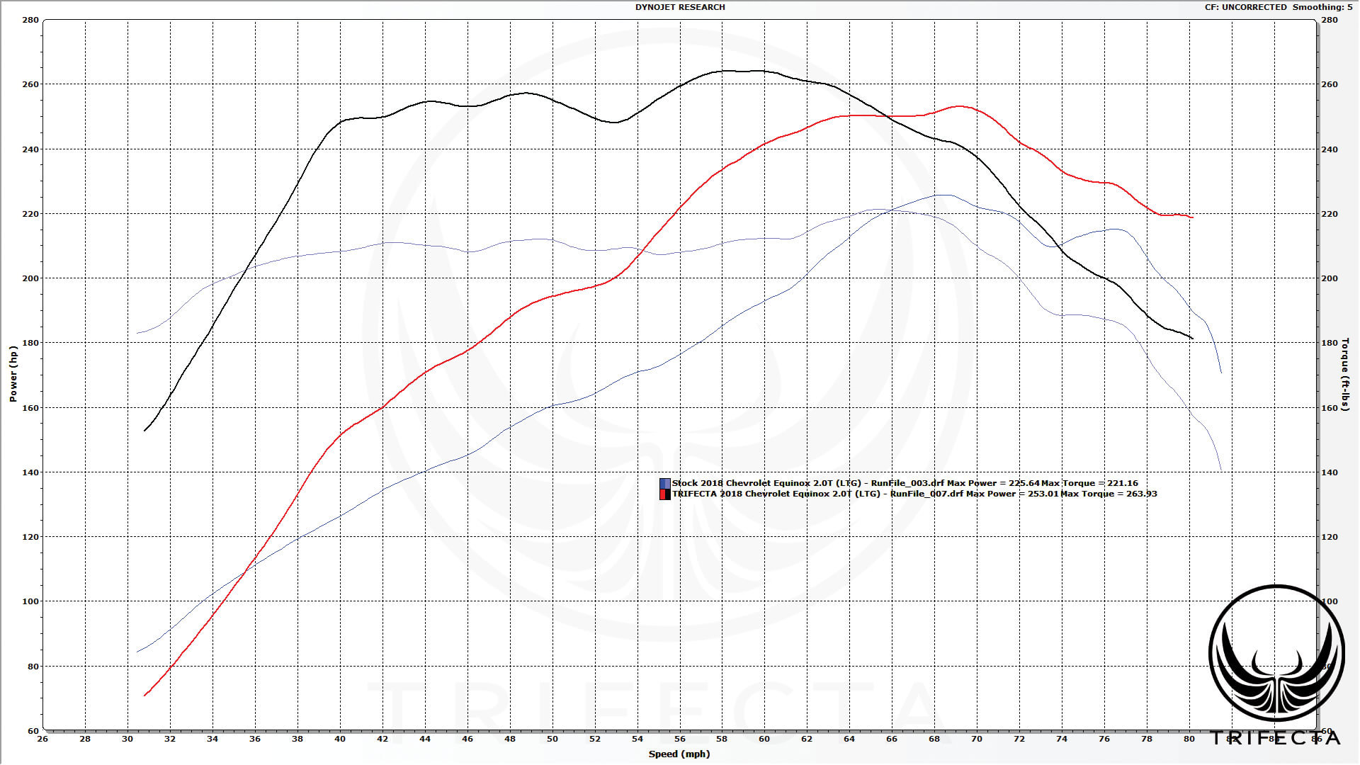 Being a test engineer and amateur car racer/ mechanic, I have little trust in most “Seat of the pants” reviews. I believe in real lap times and acceleration time data when validating modifications. Here are the real facts of the Advantage tune on my 2019 2.0T Equinox. 0-60 GM Sales department advertised time stock 6.6 Sec My real life tests. 0-60 at 20c 94 Octane 7.0 sec 0-60 at 20c 87 Octane 7.2 sec 0-60 at 20c 87 Octane Trifecta Advantage Tune 6.3 sec Real power increase to go from 7.0 to 6.3 sec is about 24 HP Trifecta tunes deliver. BTW: Thank you for the ability to select the performance mode using the CC. Even though the performance mode works good for sporty driving I find shifts too jumpy during my daily commute. Yet …even with CC on if I nail the throttle, I still get maximum down shift and full power of the tune when I need it.